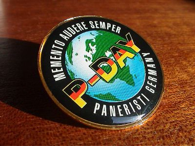 La spilla e la cartolina del P-Day, inviate poi ai partecipanti, dal Team del P-Day